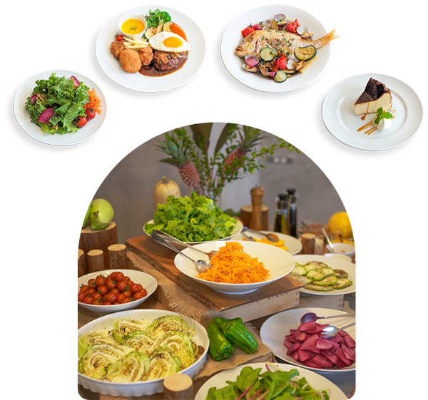 提携農家から仕入れる旬のオーガニック野菜を使用したサラダバーを中心に、素材の味を活かした料理をご提供します。