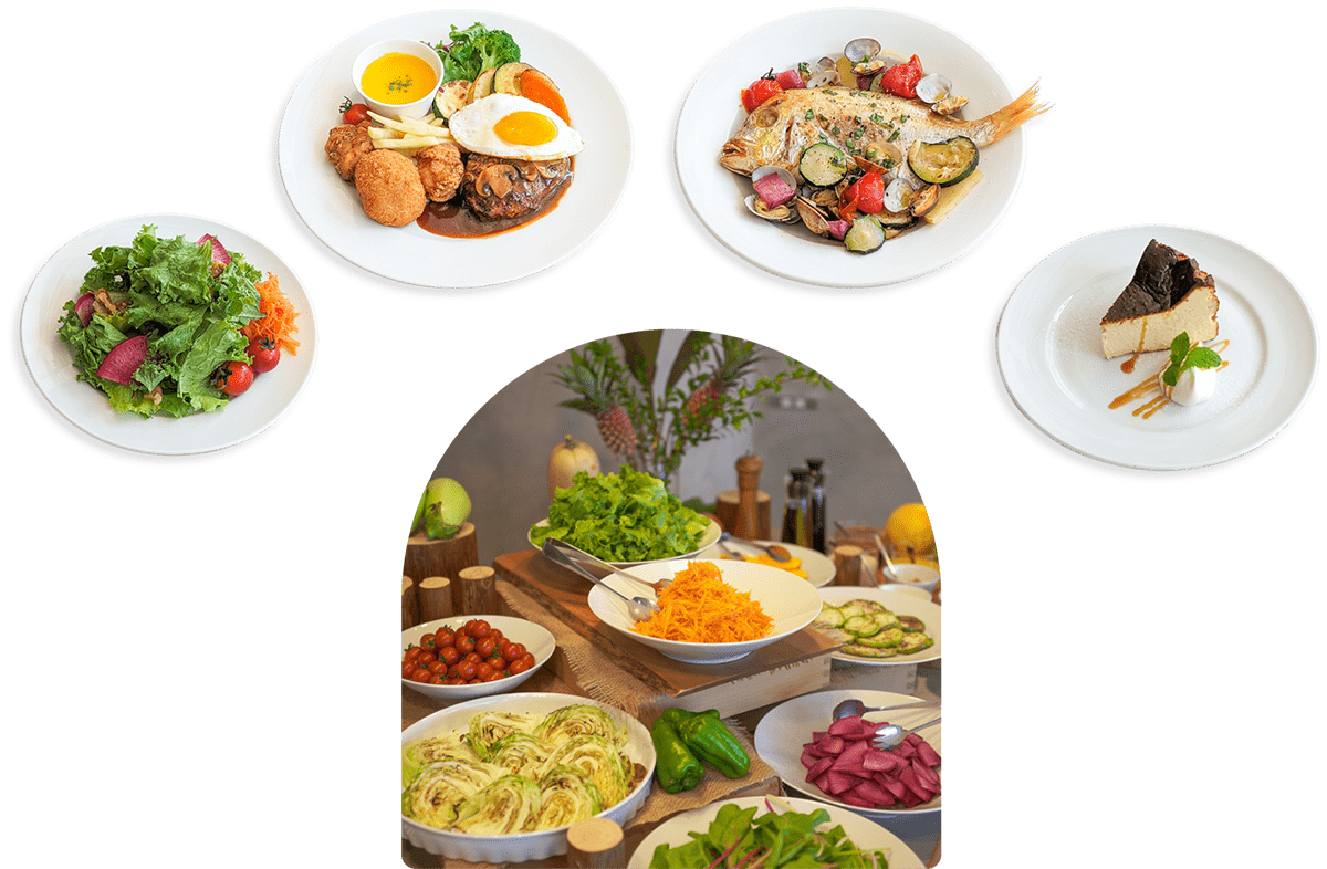 提携農家から仕入れる旬のオーガニック野菜を使用したサラダバーを中心に、素材の味を活かした料理をご提供します。