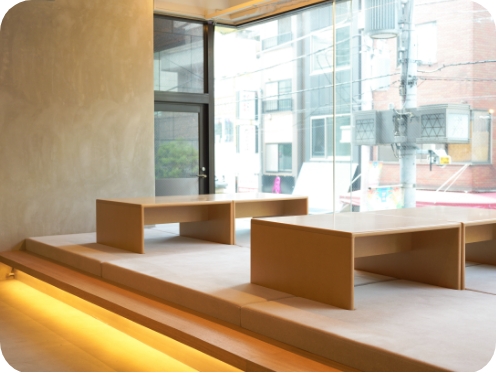 窓際には、赤ちゃんも寝転がれる小上がり席をご用意しました。足をのばしてゆっくりお寛ぎください。